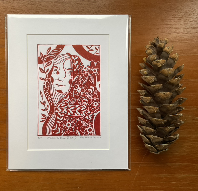 All art relief prints are my own design and are handmade, so each is unique to you. Expect little variations in texture and some distinctive impressions within each handprinted limited edition. My process isn't high tech. Designs are created on my living room table by hand with a wooden baren and the back of a soup spoon. Every piece is numbered, titled and signed on white paper. Prints are mailed flat in protected packaging for safe delivery.