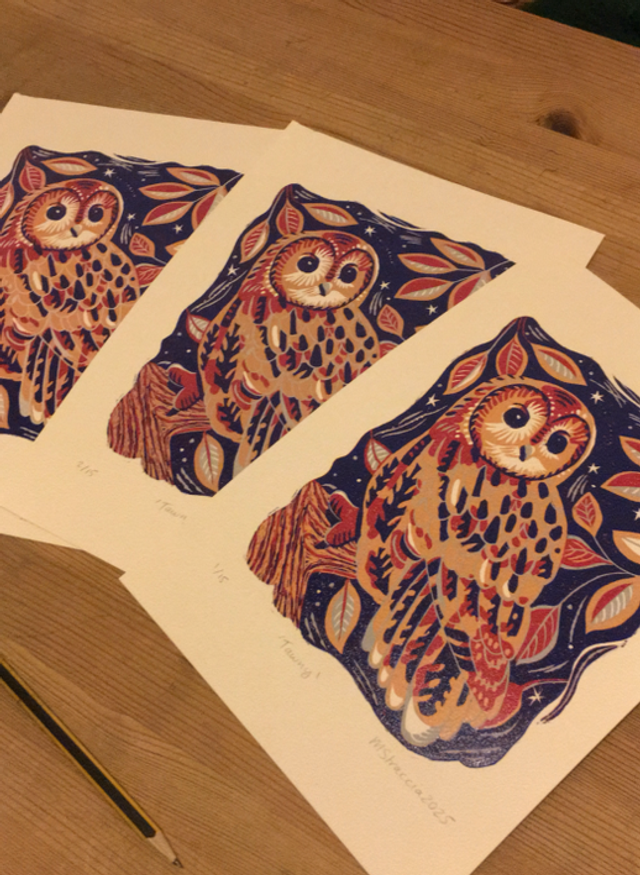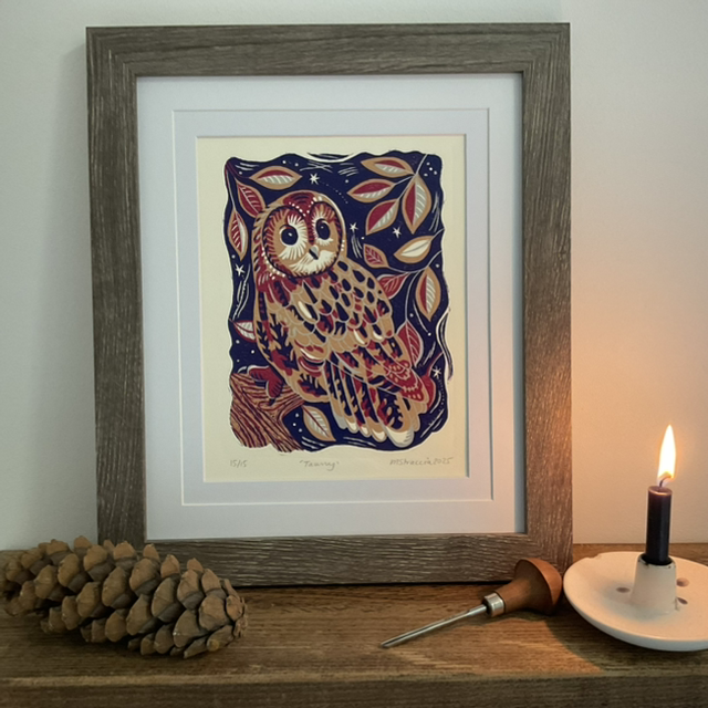 Handprinted reduction linocut print of ‘Tawny’. Printed with a wooden spoon on my living room table.